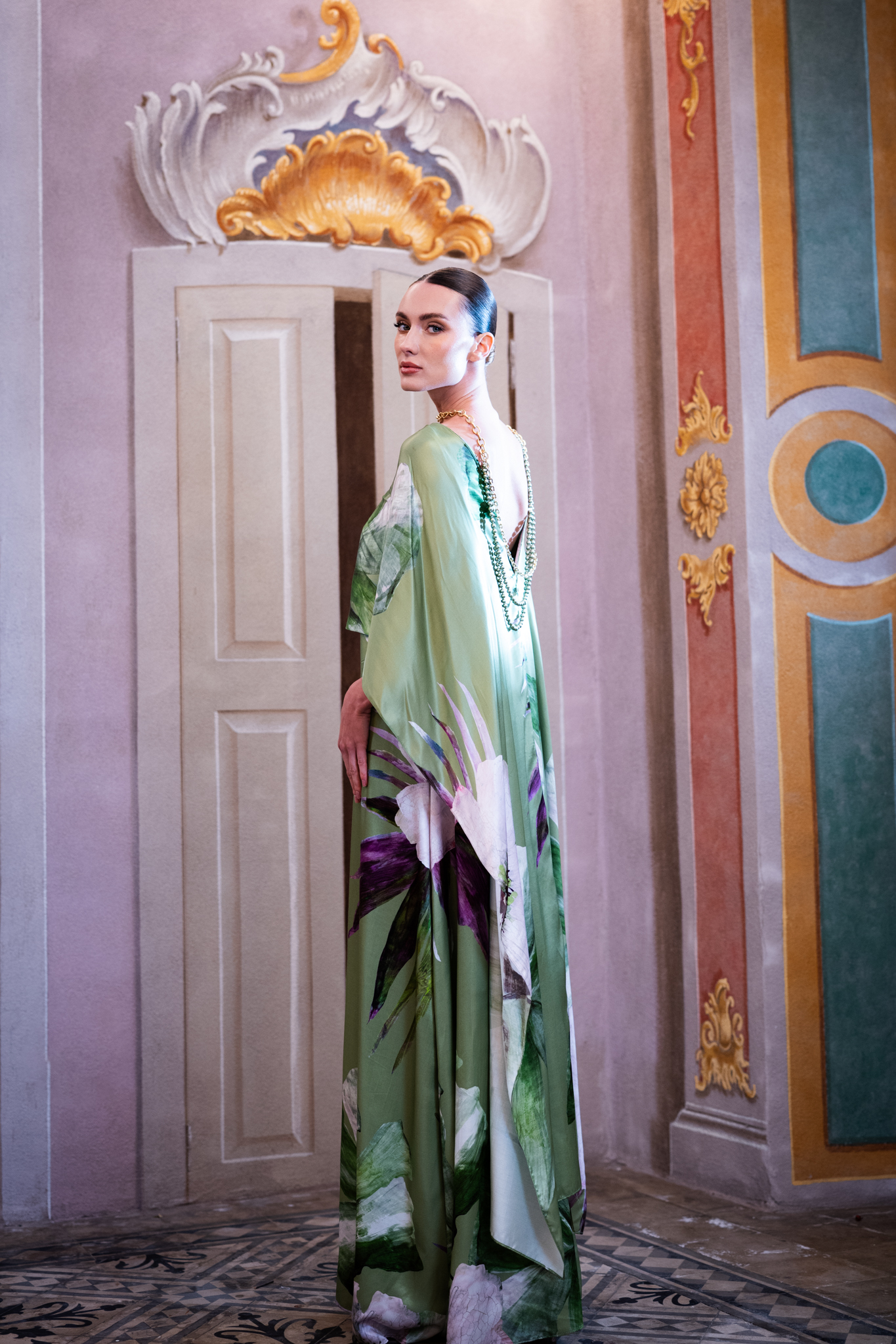 Abito lungo dalla linea fluida e leggera , impreziosito da un delciata fantasia floreale.