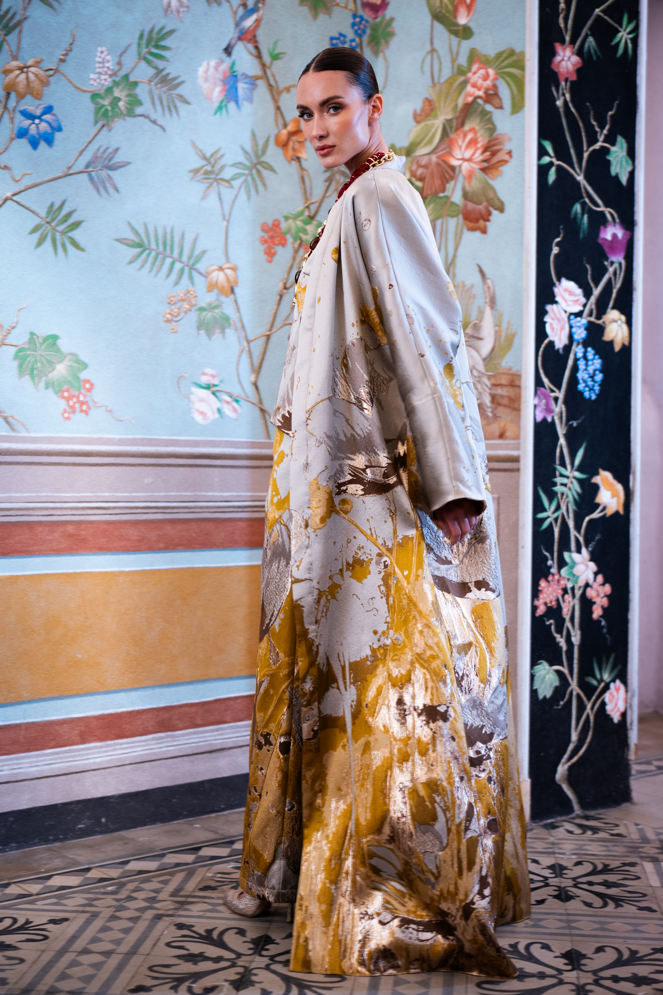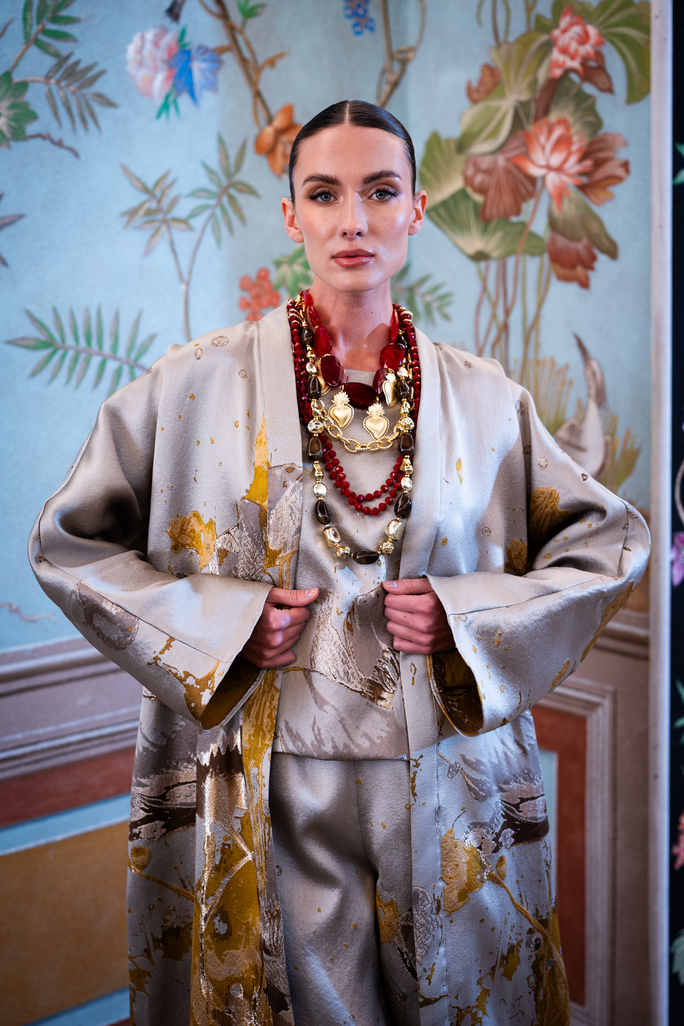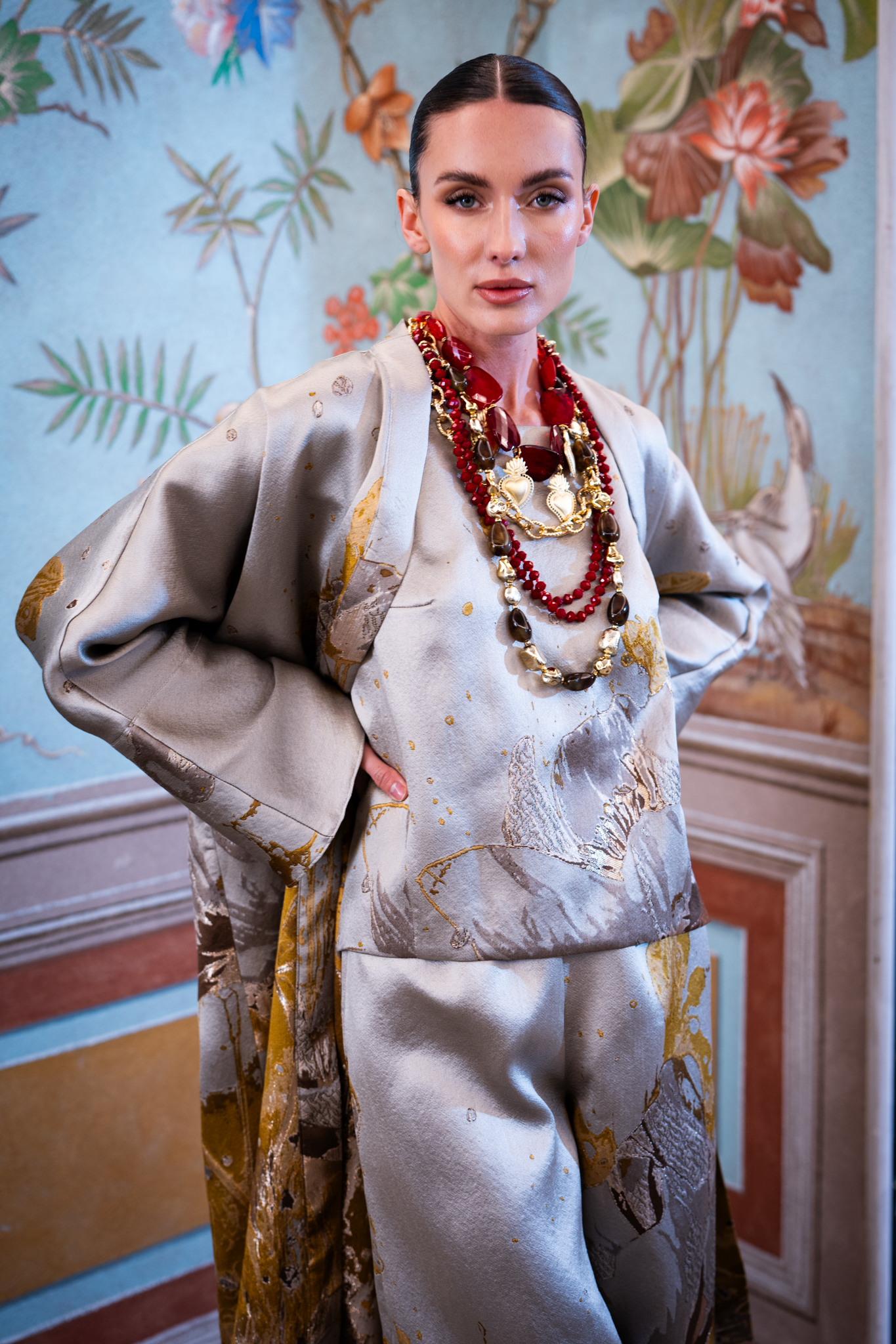 Completo tre pezzi dal fascino artistico, composto da kimono lungo, pantaloni palazzo e top in jaquard con fantasia pittorica che ricorda i quadri del famoso pittore Klimt.